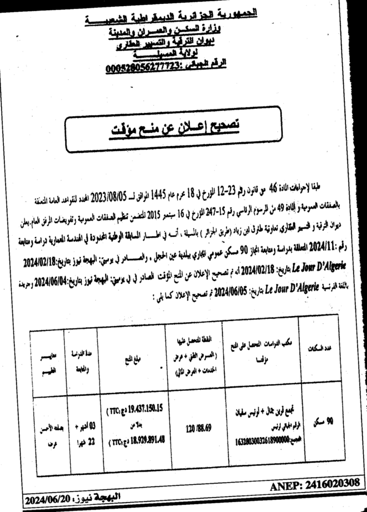 تصحيح إعلان عن منح مؤقت/ديوان الترقية والتسيير العقاري لولاية المسيلة