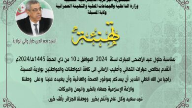 وبهذه المناسبة الكريمة أتقدم باسمي الخاص وباسم كل إطارات وموظفي ومواطني ولاية المسيلة بأخلص عبارات التهنئة، متمنيا لكم دوام الصحة والعافية والمزيد من التألق والإبداع ، كمثال يقتدى به لشباب ولاية المسيلة.