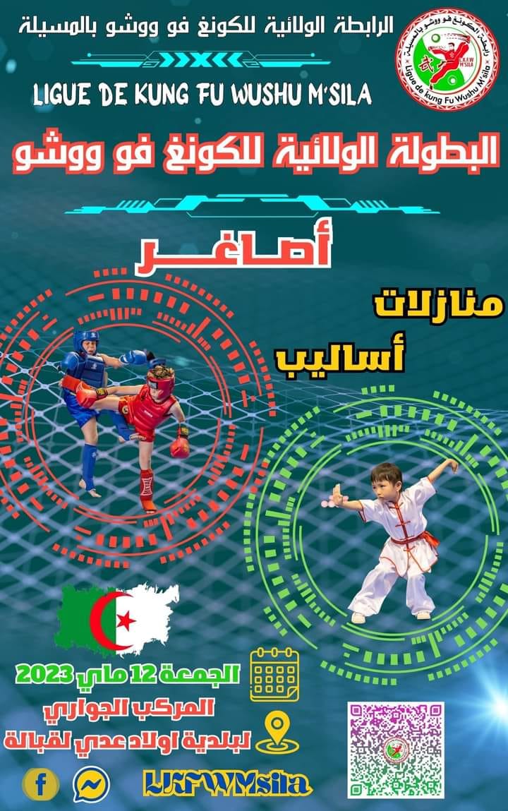المسيلة/ يحتضن المركب الرياضي الجواري لبلدية أولاد عدي لقبالة البطولة الولائية للكونغ فو ووشو – أصاغر ”أساليب-منازلات يوم الجمعة 12 ماي 2023.