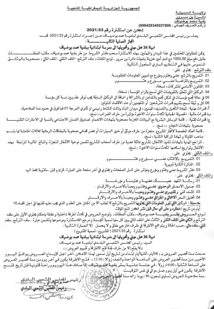 إعلان عن استشارة 2021/33: تهيئة 26 محل مهني وتحويلها إلى مدرسة إبتدائية ببلدية محمد بوضياف
