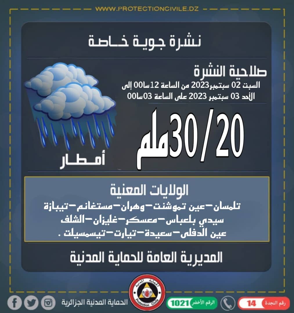 ليوم السبت 02-09-2023 ابتدآءا من الساعة 12سا00د إلى غاية يوم الأحد 03-09-2033 على الساعة 03سا00د ، تميز الولايات الآتية: للمزيد من التفاصيل على موقع الديوان الوطني للأرصاد الجوية :