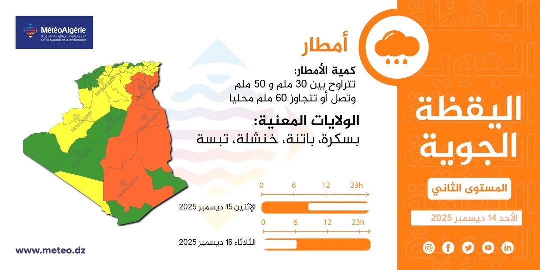 المسيلة/ على إثر النشرية الجوية الخاصة من الدرجة الثالثة باللون الأصفر والتي تحذر من تساقط أمطار رعدية، عبر إقليم الولاية والولايات المجاورة لتراب الولاية (15 إلى 20 ملم).