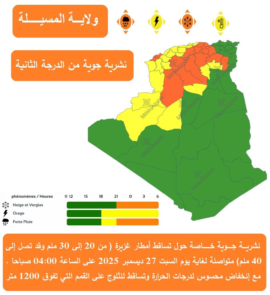 المسيلة/ على إثر النشرية الجوية الخاصة من الدرجة الثانية (اللون البرتقالي) والتي تحذر من تساقط أمطار غزيرة، (من 20 إلى 30 ملم وقد تصل إلى 40 ملم) عبر تراب الولاية والولايات المجاورة التالية: (المدية، البويرة، برج بوعريريج، سطيف، باتنة، بسكرة، أولاد جلال الجلفة) مع إمكانية تساقط للثلوج على المرتفعات التي تفوق 1200 متر.