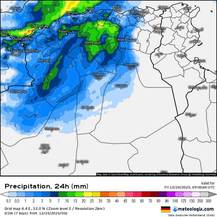 صلاحية النشرية متواصلة لغاية يوم السبت 27 ديسمبر 2025 على الساعة 04:00 صباحا، خطر تشكل السيول وجريان الأودية وارد جدا، وعليه ننبه كافة مواطني الولاية مع ضرورة أخذ الحيطة والحذر.