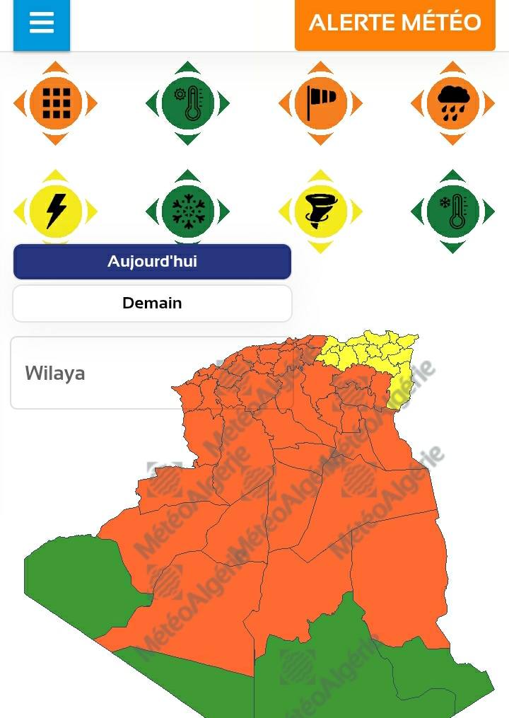 المسيلة/ نشرية جوية خاصة من الدرجة الثانية (اللون البرتقالي) والتي تحذر من تساقط أمطار غزيرة قد تكون مرفوقة بحبات البرد الغزارة شمال وجنوب غرب الولاية (من 10 إلى 20 ملم وقد تصل إلى 30 في بعض المناطق)، كما تحذر النشرية هبوب رياح قوية محملة بالأتربة من 60 إلى 70 كم/ سا وقد تصل هبات الرياح إلى 80 و90 كم/ سا.