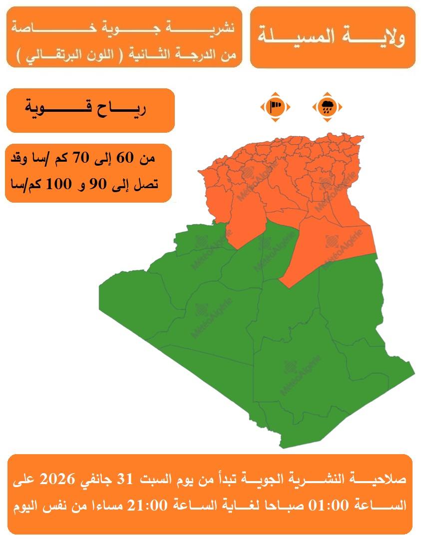 نشرية جوية خاصة والتي تحذر من هبوب رياح قوية (من 60 إلى 70 كم/سا وقد تصل إلى 90 كم/سا) عبر تراب الولاية والولايات المجاورة التالية: الجلفة. أولاد جلال. بسكرة. باتنة. سطيف. برج بوعريريج. البويرة. المدية.