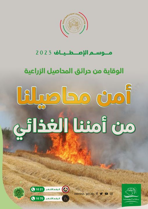 نحمي غابتنا نحمي أرواحنا وثروتنا الغابية، صيف الجزائر بلادنا تجمعنا، الوقاية من حرائق المحاصيل الزراعية، أمن محاصيلنا من أمننا الغذائي.