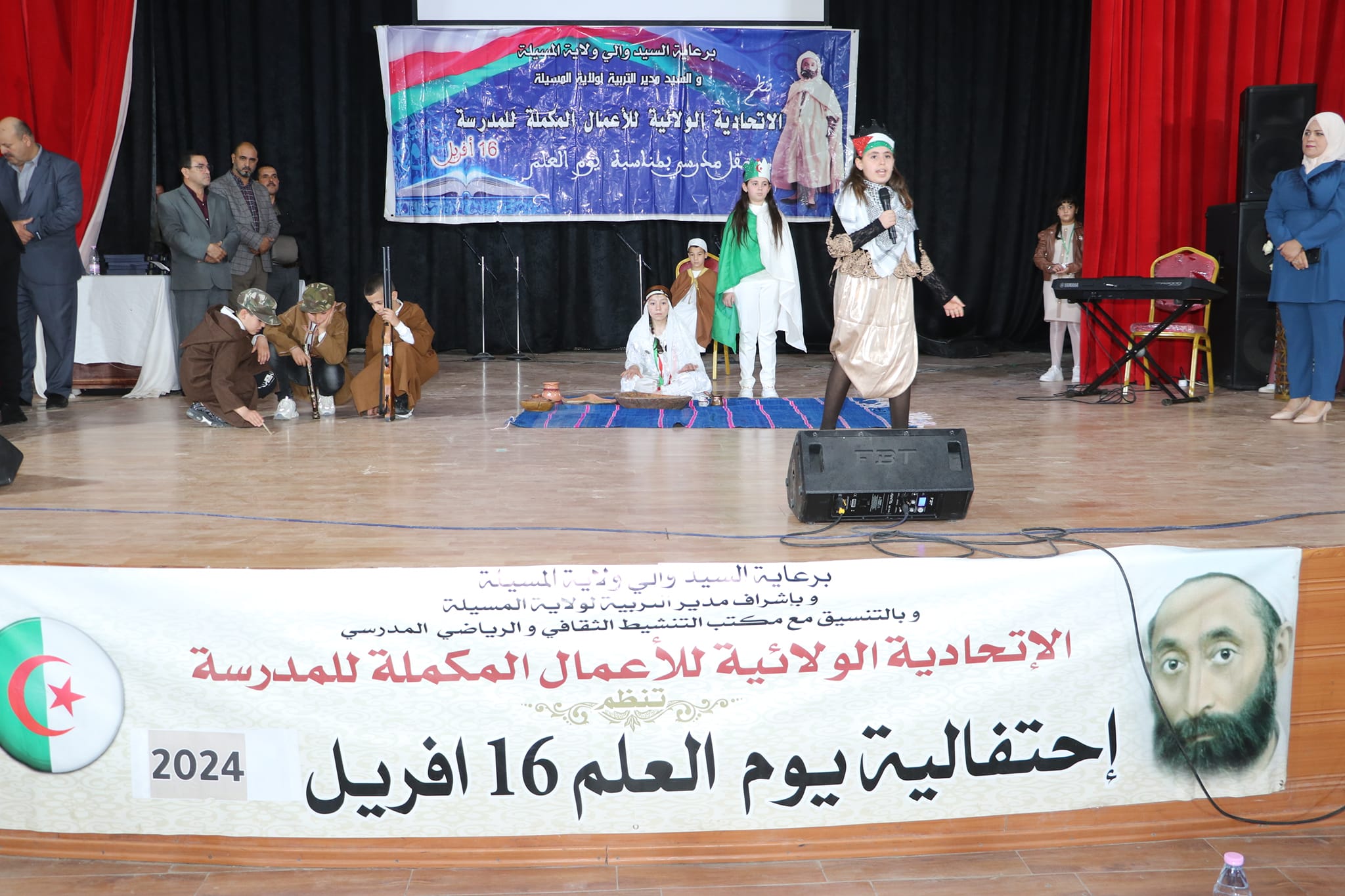 المسيلة/ أشرف نهار اليوم الثلاثاء 16 أفريل السيد نجم الدين طيار والي الولاية على إفتتاح فعاليات مناسبة يوم العلم الموافق ليوم 16 أفريل من كل سنة بدار الثقافة الشهيد قنفود الحملاوي ببلدية المسيلة، حضر المناسبة السيد رئيس المجلس الشعبي الولائي، أعضاء اللجنة الولائية للأمن، أعضاء البرلمان بغرفتيه، المندوب المحلي لوسيط الجمهورية، أعضاء المجلس الأعلى للشباب، ممثل المرصد الوطني للمجتمع المدني، رئيس الدائرة، مدير الجامعة، مدير التربية، مدراء الهيئة التنفيذية، رئيس المجلس الشعبي لبلدية المسيلة، أسرة قطاع التربية، أسرة الجامعة، أسرة التكوين المهني، أعضاء المجلس الشعبي الولائي، ممثلي الحركة الجمعوية والمجتمع المدني، الطلبة والتلاميذ والأسرة الاعلامية.