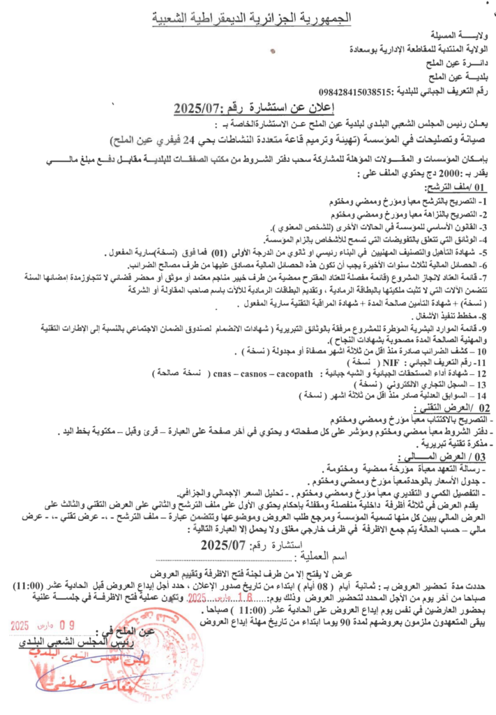 تهيئة وترميم قاعة متعددة النشاطات بحي 24 فيفري عين الملح10 مارس، 20250 35 شاركها فيسبوك X مشاركة عبر البريد طباعة