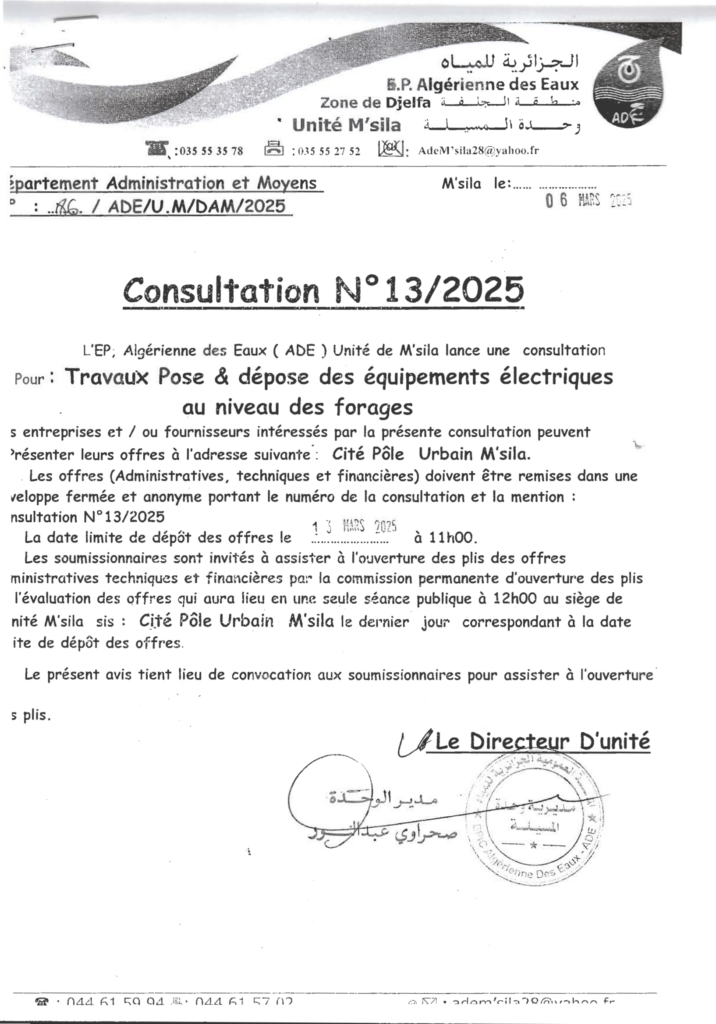 إستشارة 2025/13 الجزائرية للمياه وحدة المسيلة