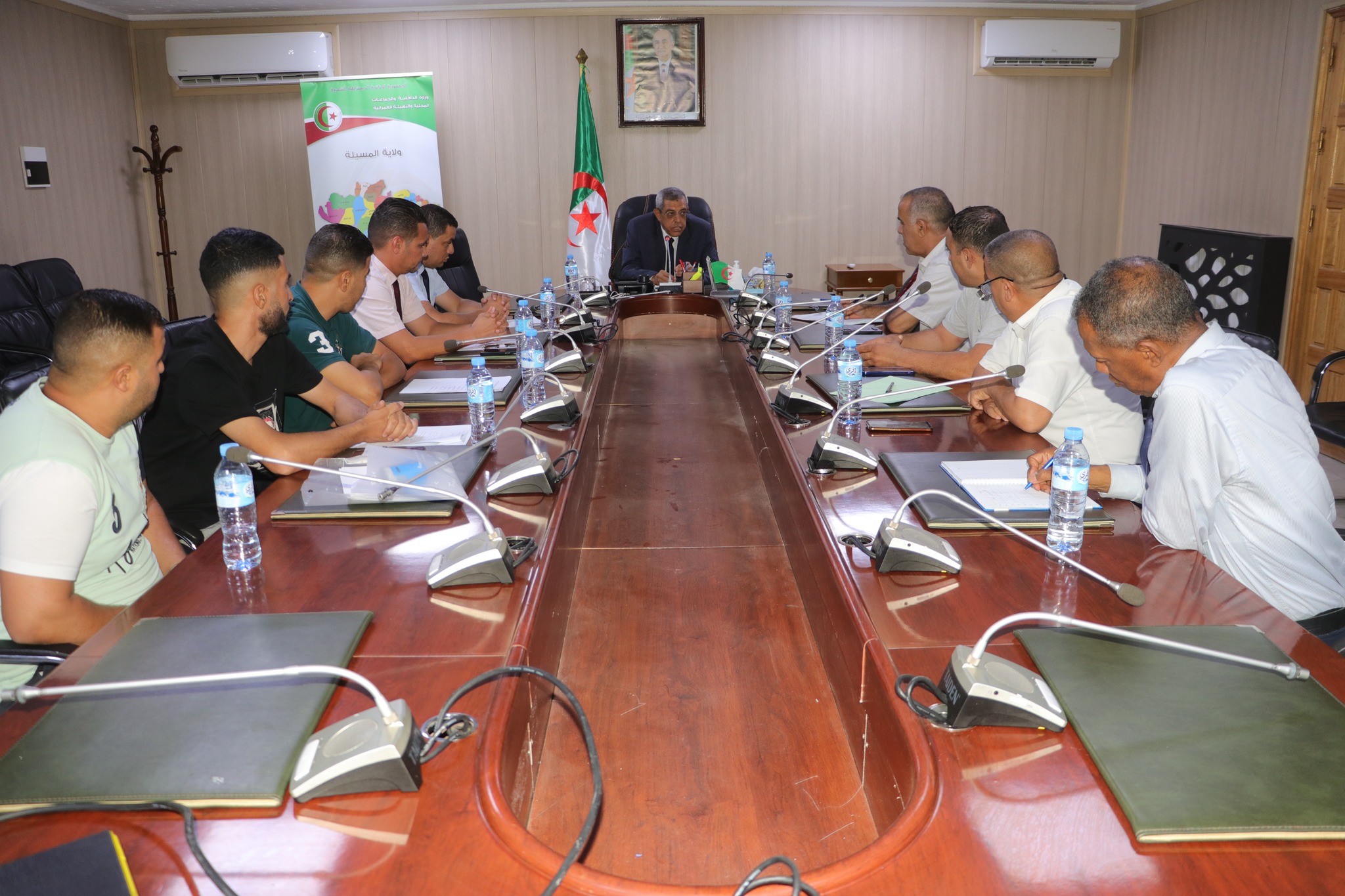 المسيلة/ إستقبل اليوم الثلاثاء 29 جويلية 2025 السيد نجم الدين طيار والي الولاية بقاعة الإجتماعات أحمد الغازي بمقر الولاية، أعضاء المكتب المسير لفريق وفاق المسيلة، بحضور السادة: رئيس المجلس الشعبي الولائي بالنيابة، رئيس دائرة المسيلة، مدير الشباب والرياضة، رئيس المجلس الشعبي لبلدية المسيلة بالنيابة، عضوين بالمجلس الشعبي لبلدية المسيلة، وملحق بالديوان.