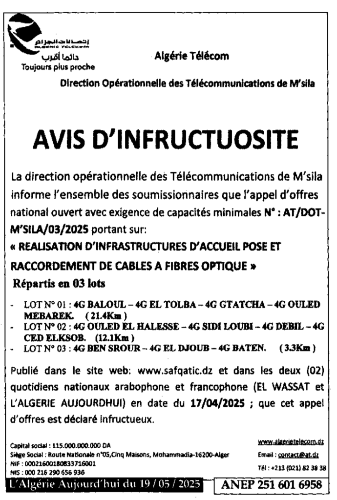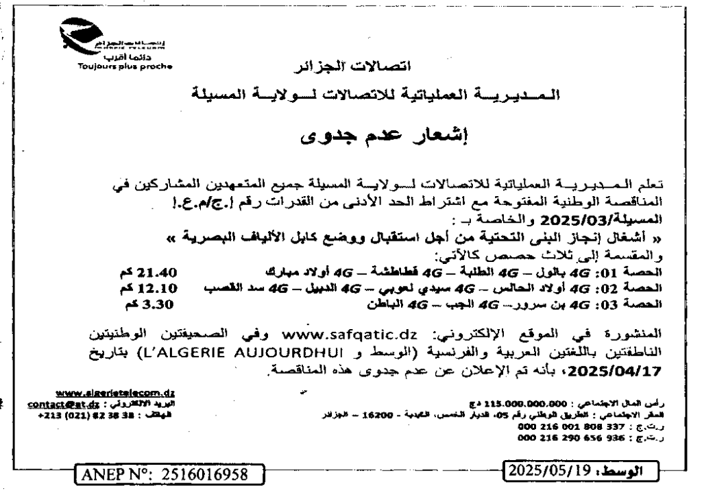 إشعار عدم جدوى أشغال انجاز البنى التحتية من أجل استقبال ووضع كابل الألياف البصرية/ المديرية العملياتية للاتصالات لولاية المسيلة