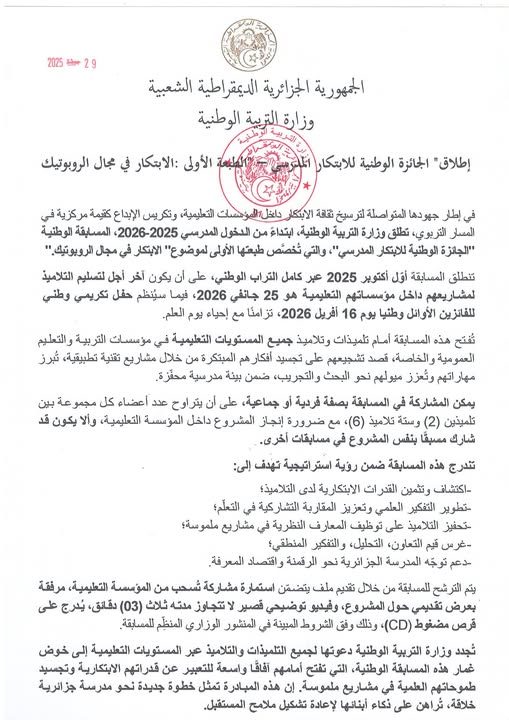 إطلاق “الجائزة الوطنية للابتكار المدرسي” الطبعة الأولى الابتكار في مجال الروبوتيك