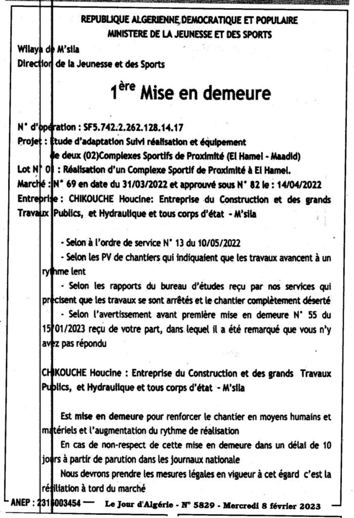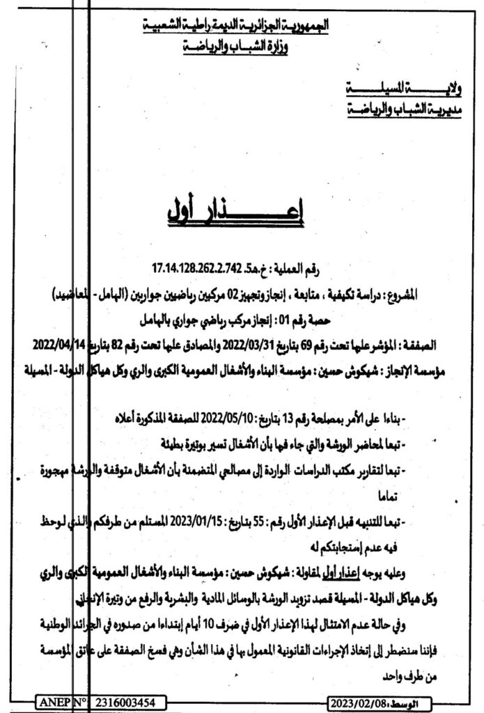 إعذار أول/ مديرية الشباب والرياضة لولاية المسيلة