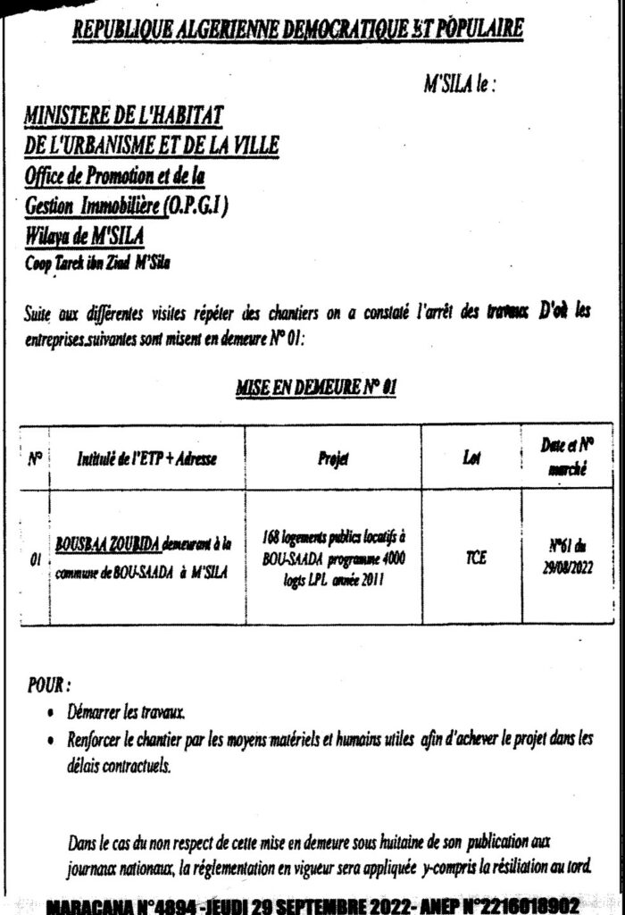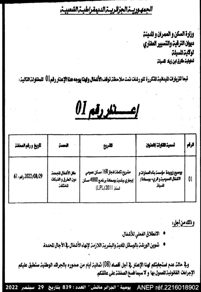 إعذار رقم 01: ديوان الترقية والتسير العقاري لولاية المسيلة