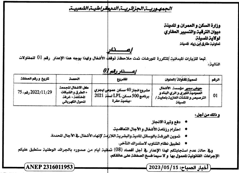 إعذار رقم 01/ ديوان الترقية والتسيير العقاري لولاية المسيلة