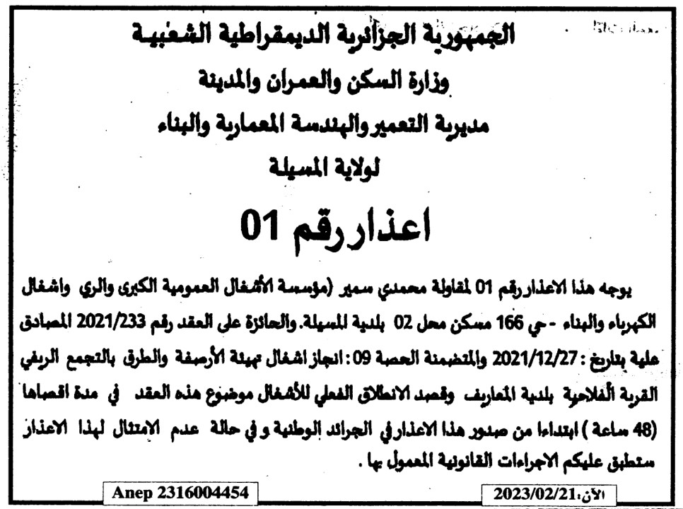 إعذار رقم 01/ مديرية الأشغال العمومية لولاية المسيلة