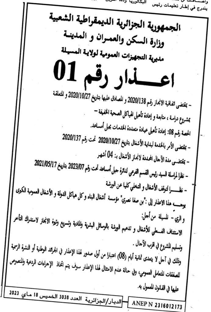 إعذار رقم 01/ مديرية التجهيزات العمومية لولاية المسيلة