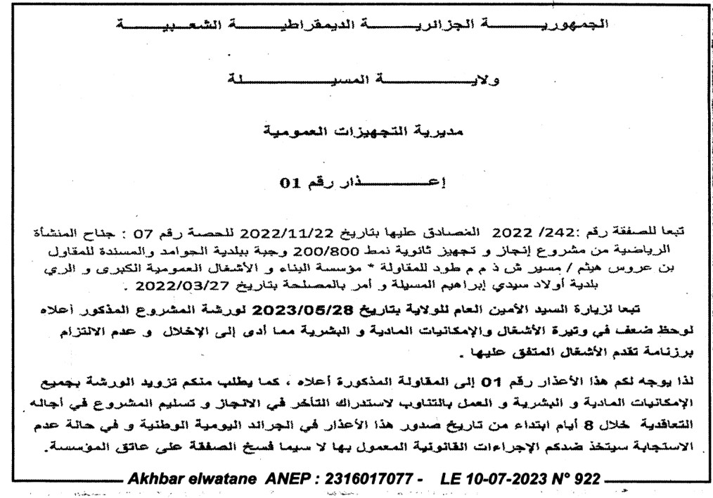 إعذار رقم 01/ مديرية التجهيزات العمومية لولاية المسيلة