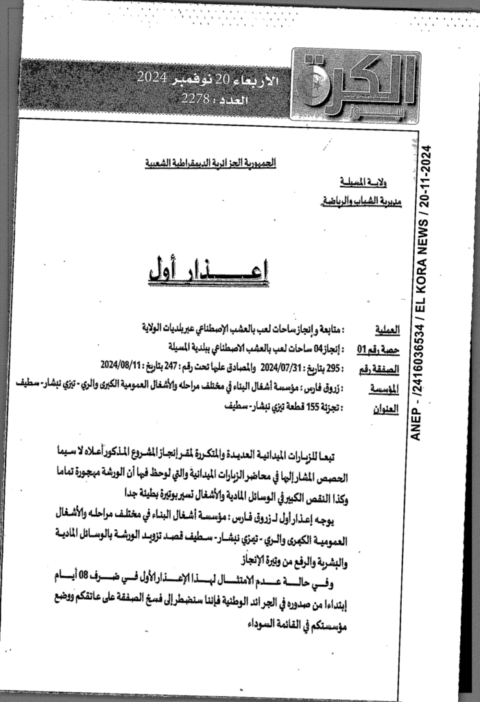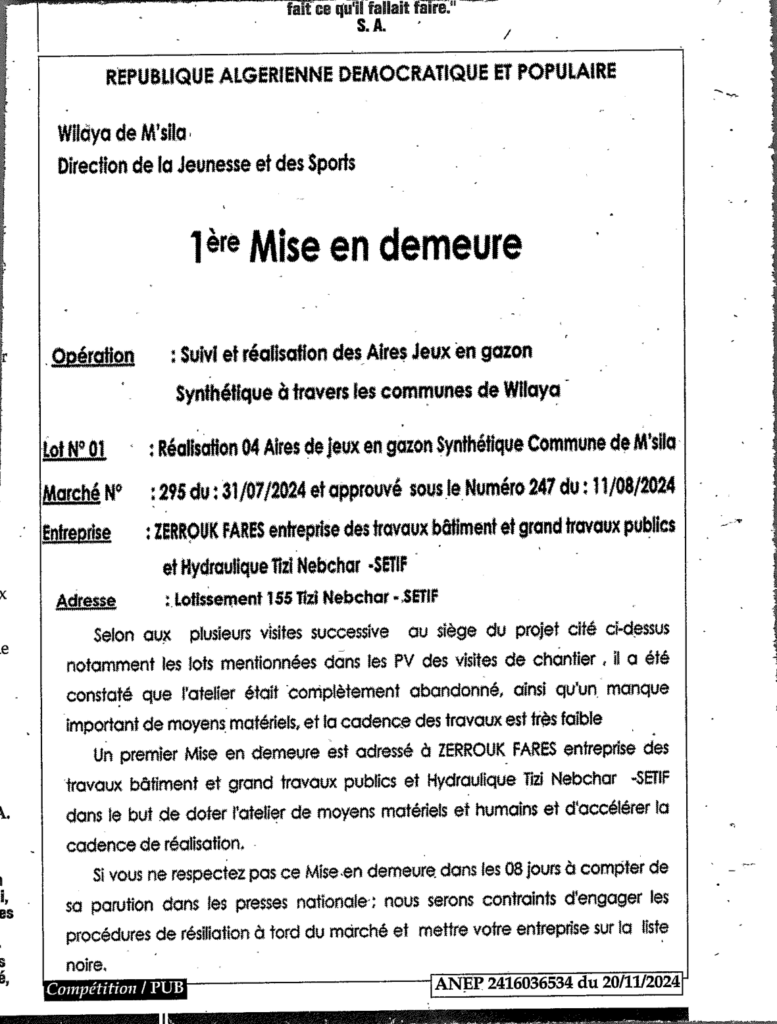 إعذار رقم 01 مديرية الشباب والرياضة لولاية المسيلة