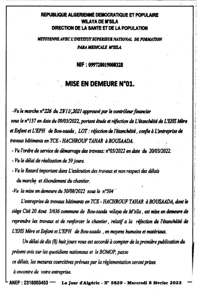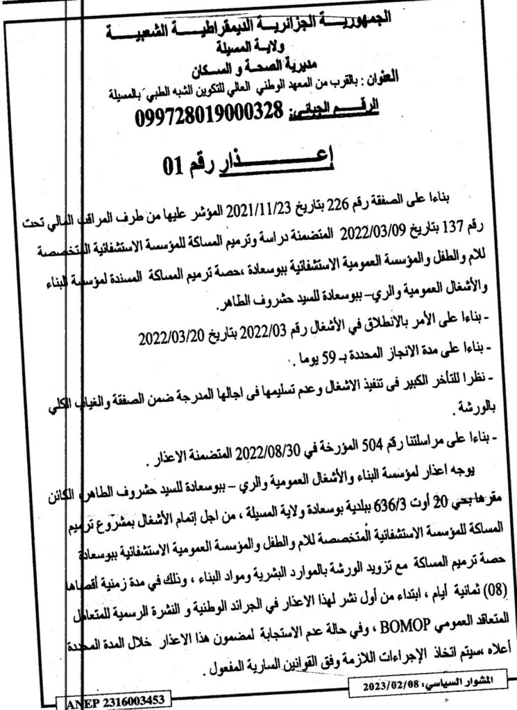 إعذار رقم 01 / مديرية الصحة والسكان لولاية المسيلة