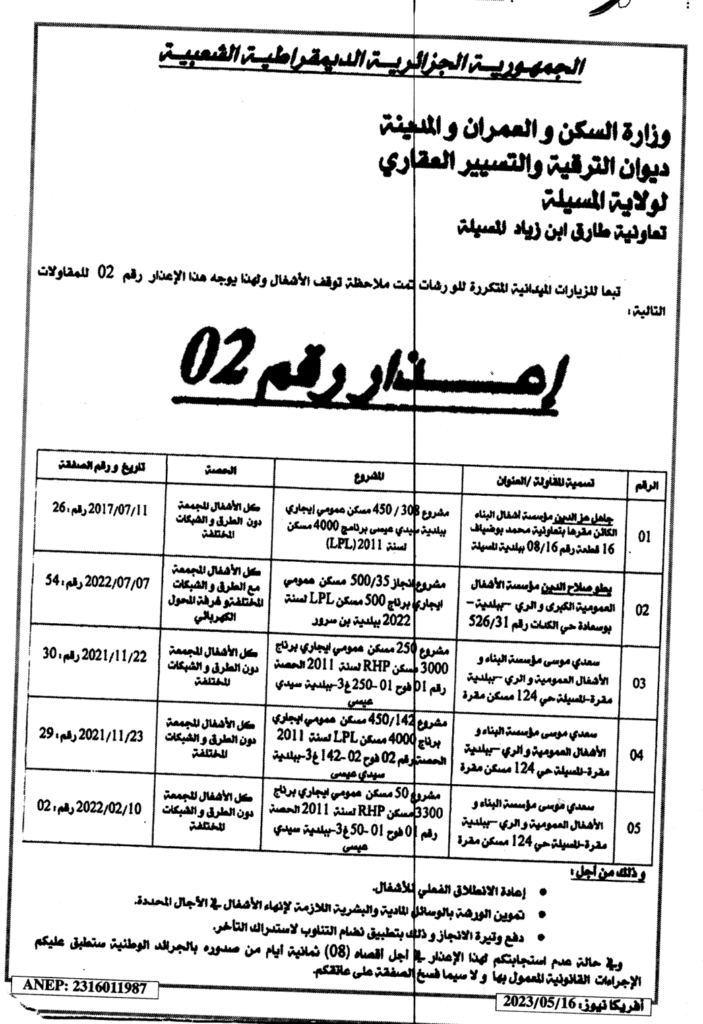 إعذار رقم 02/ ديوان الترقية والتسيير العقاري لولاية المسيلة