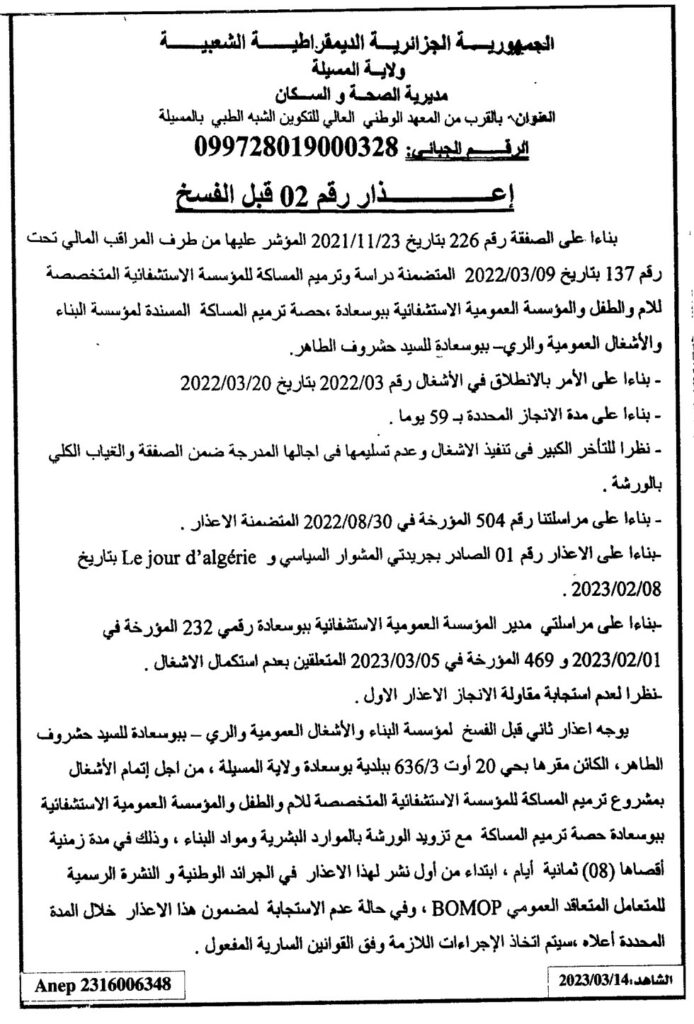 إعذار رقم 02 قبل الفسخ/ مديرية الصحة والسكان