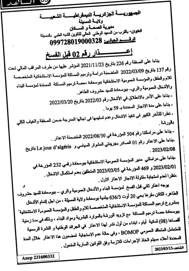 إعذار رقم 02 قبل الفسخ/ مديرية الصحة والسكان لولاية المسيلة