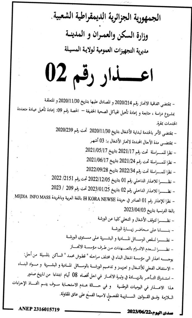 إعذار رقم 02/ مديرية التجهيزات العمومية لولاية المسيلة