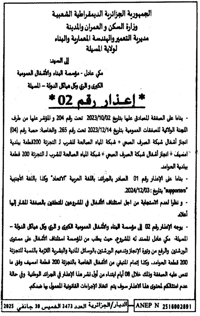 إعذار رقم 02 مديرية التعمير والهندسة المعمارية والبناء لولاية المسيلة
