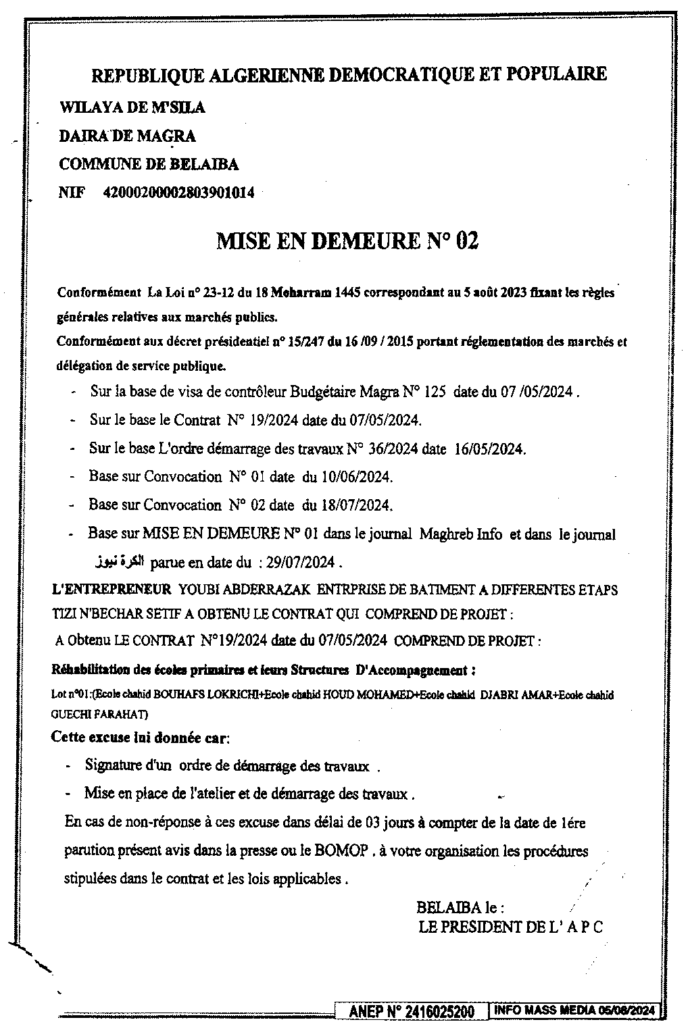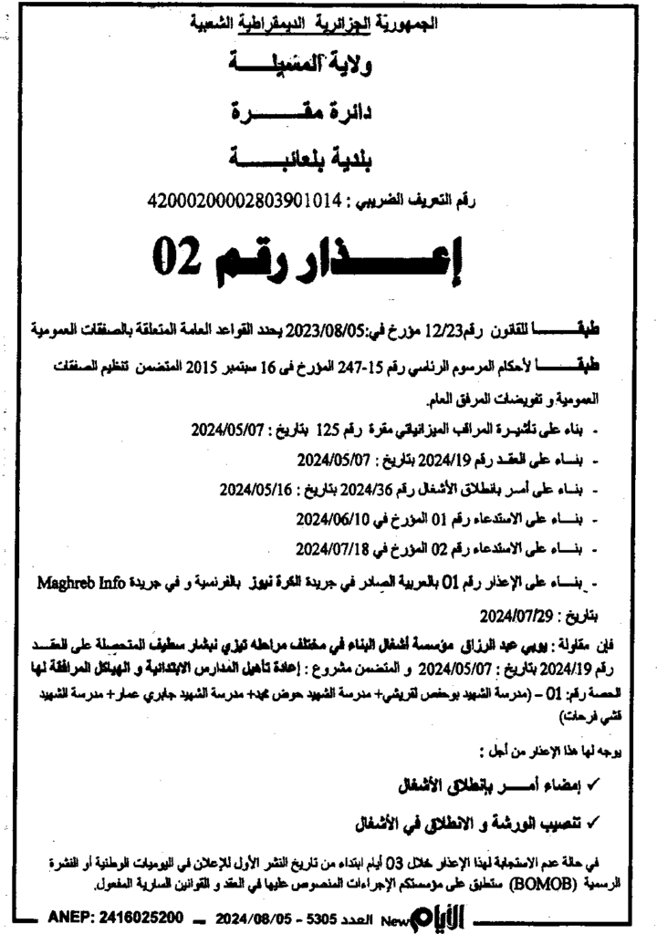 إعذار رقم 02 من أجل إعادة تأهيل المدارس الابتدائية/ بلدية بلعايبة