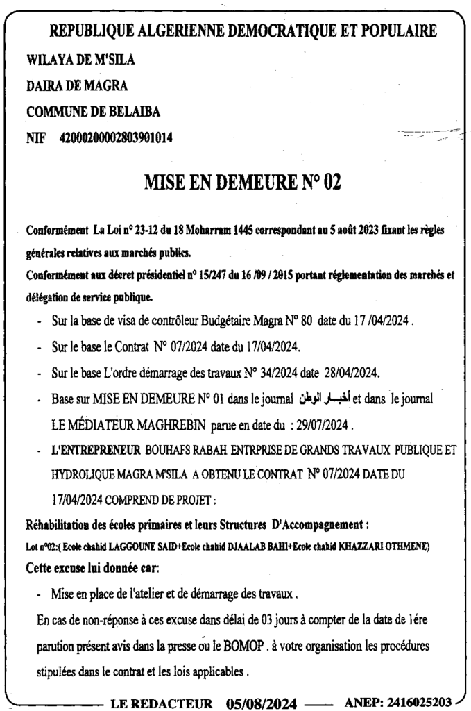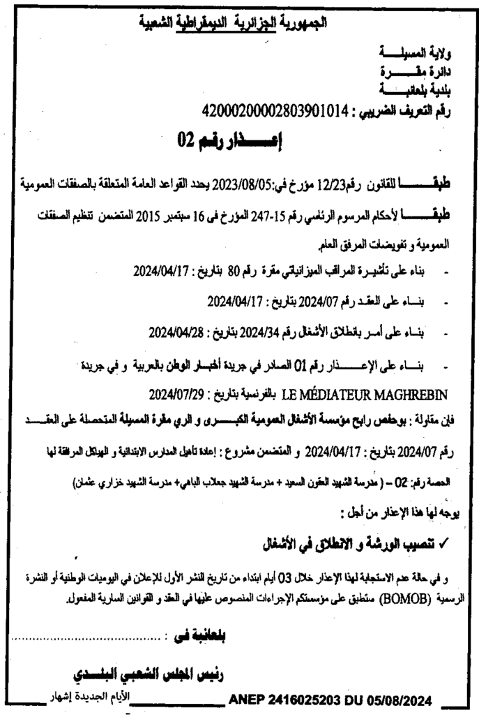 إعذار رقم 02 من أجل تنصيب ورشة والانطلاق في الأشغال/ بلدية بلعايبة