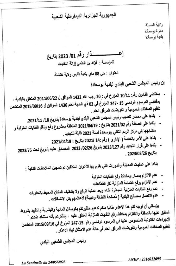إعذار رقم 2023/01 بلدية بوسعادة