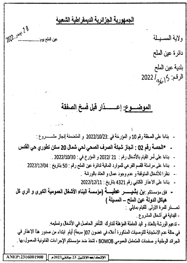 المتظمنة انجاز مشروع: الحصة رقم 02: انجاز شبكة الصرف الصحي لحي شمال 20 سكن تطوري حي القدس23 يناير، 20230 21 شاركها فيسبوك X مشاركة عبر البريد طباعة