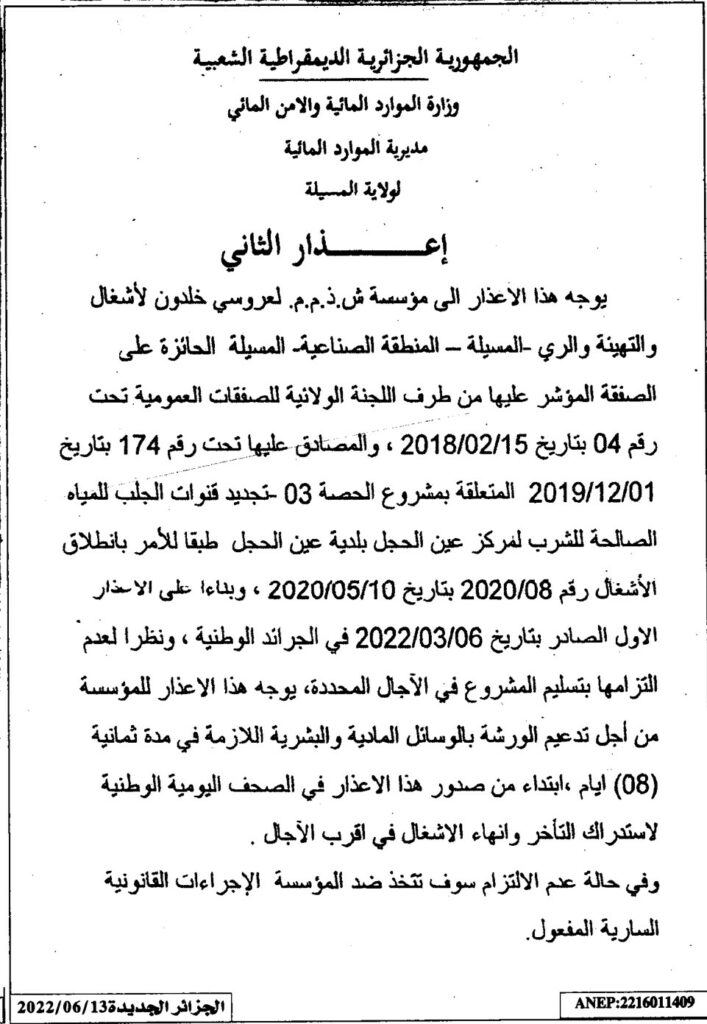 إعــذار الثاني لمديرية الوارد المائية ولاية المسيلة