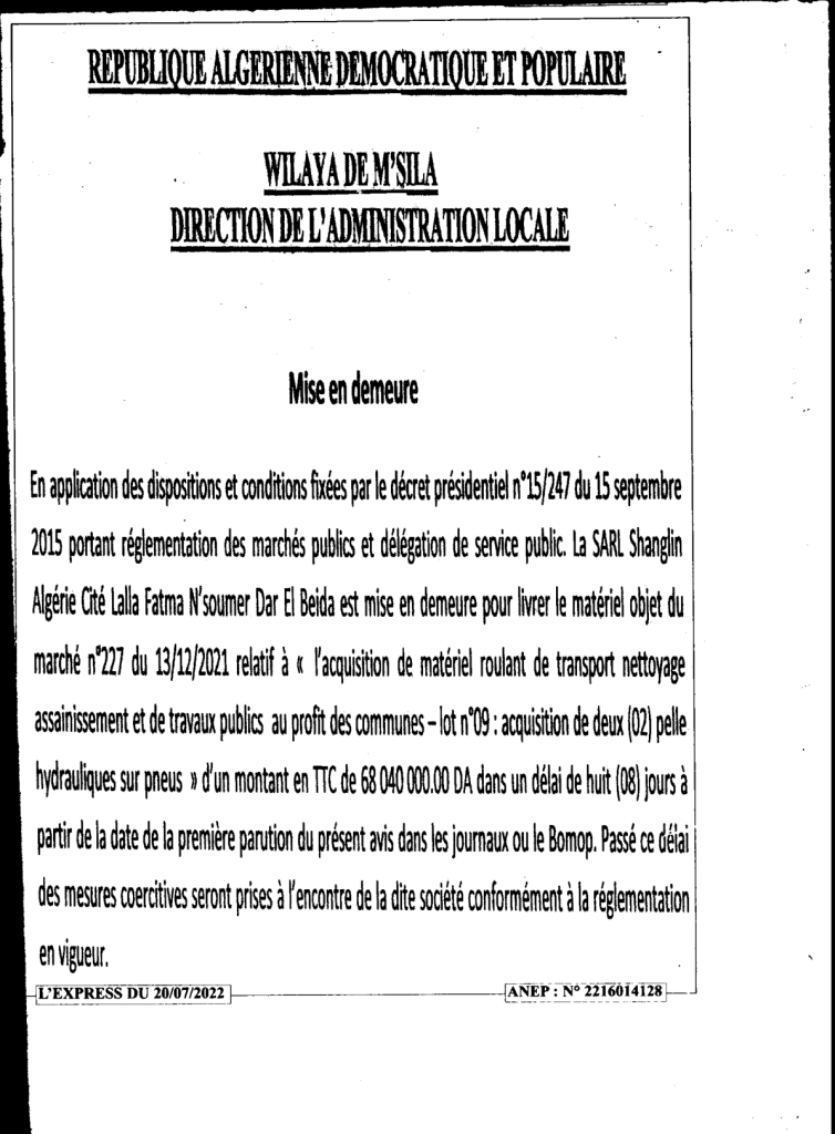 إعـــذار مديرية الإدارة المحلية ليوم 20 جويلية 2022
