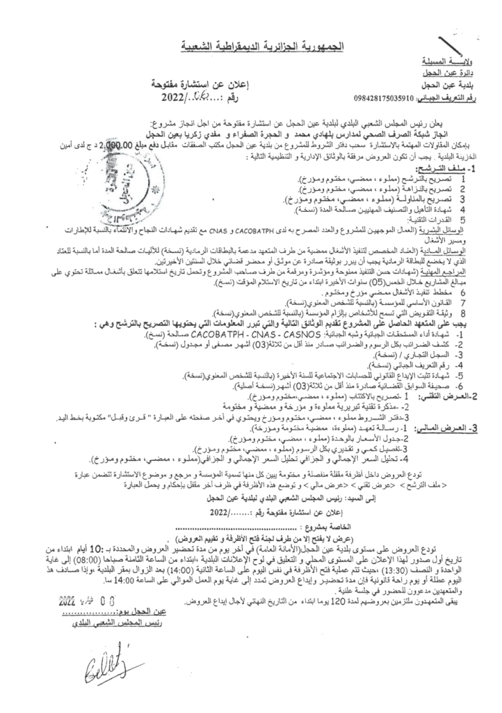إعــلان عن استشارة مفتوحـة 2022/06: انجـاز شبكـة الصرف الصـحي لمـدارس بلهادي محمد والحجـرة الصفراء ومفـدي زكريا / بلديـة عيـن الحجل