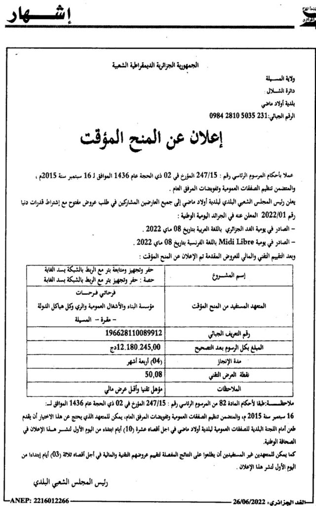 تم الاعلان عن المنح المؤقت للمشروع حفر وتجهيز ومتابعة بئر مع الربط بالشبكة بسد الغابة26 يونيو، 20220 10 شاركها فيسبوك X مشاركة عبر البريد طباعة