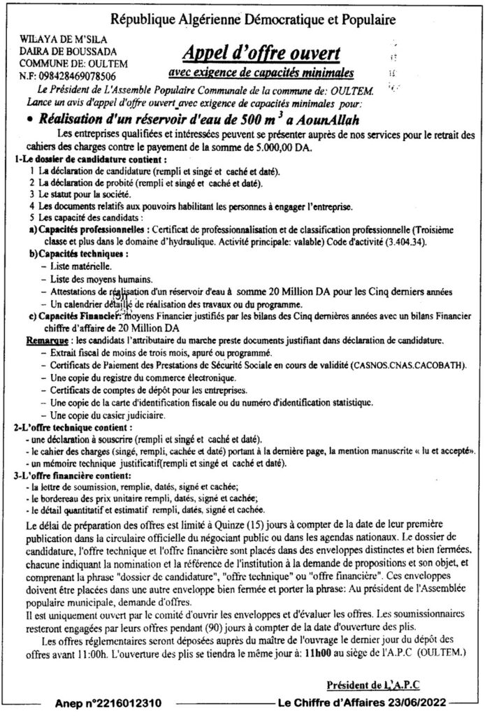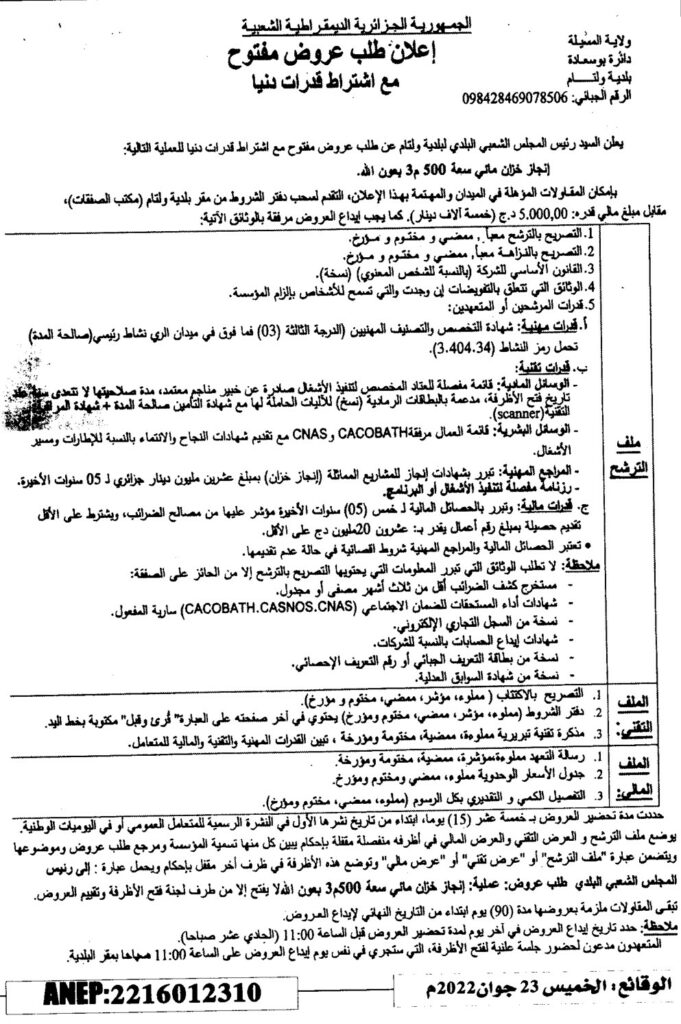طلب عروض مفتوح مع اشتراط قدرات دنيا للعملية التالية: إنجاز خزان مائي سعة 500 م3 بعون الله23 يونيو، 20220 8 شاركها فيسبوك X مشاركة عبر البريد طباعة