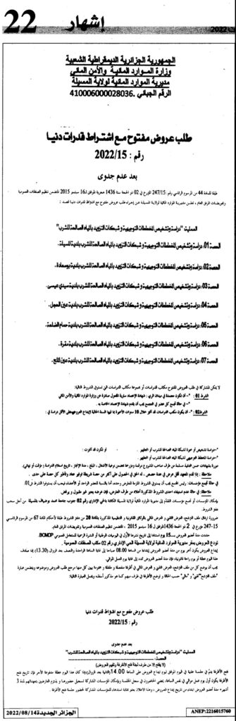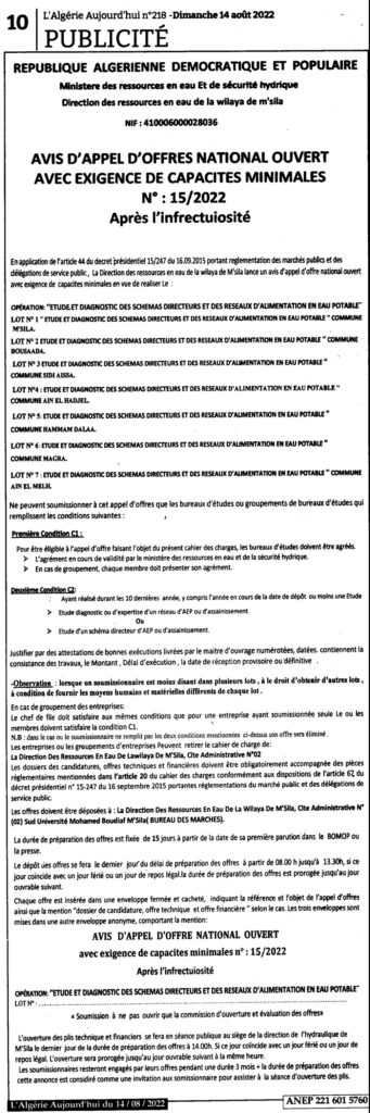إجراء طلب عروض مفتوح مع اشتراط قدرات دنيا من أجل دراسة وتشخيص المخططات التوجيهية وشبكات التزويد بالمياه الصالحة للشرب14 أغسطس، 20220 62 شاركها فيسبوك X مشاركة عبر البريد طباعة