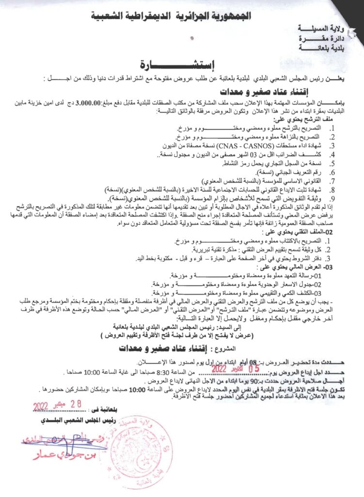 طلب عروض مفتوحة مع اشتراط قدرات دنيا وذلك من أجل: اقتناء عتاد صغير ومعدات29 سبتمبر، 20220 64 شاركها فيسبوك X مشاركة عبر البريد طباعة