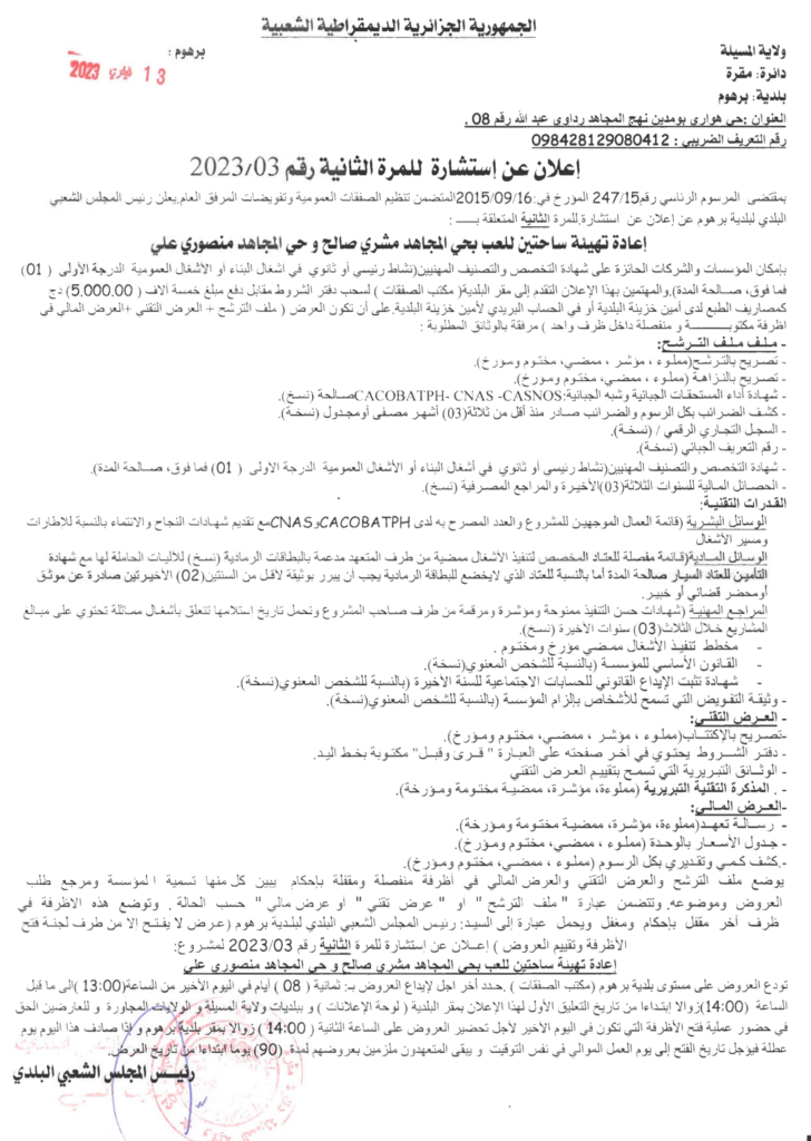 استشارة للمرة الثانية المتعلقة بـ : إعادة تهيئة ساحتين للعب بحي المجاهد مشري صالح وحي المجاهد منصوري علي13 فبراير، 20230 60 شاركها فيسبوك X مشاركة عبر البريد طباعة