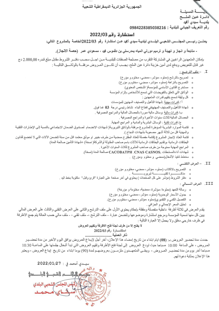 إعـلان عن استشارة 2022/03 ليوم 27 جانفي 2022 بلدية سيـدي امحمد الخاصة بـ: متابعة وانجاز وتهيئة وترميم دورتي المياه بمدرستي بن دقموس محمد، مسعودي عمر (حصة الإنجاز)
