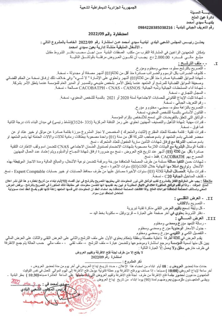 استشارة الخاصة بالمشروع التالي: الأشغال المتبقية منشأة إدارية بعين سيدي امحمد29 سبتمبر، 20220 36 شاركها فيسبوك X مشاركة عبر البريد طباعة
