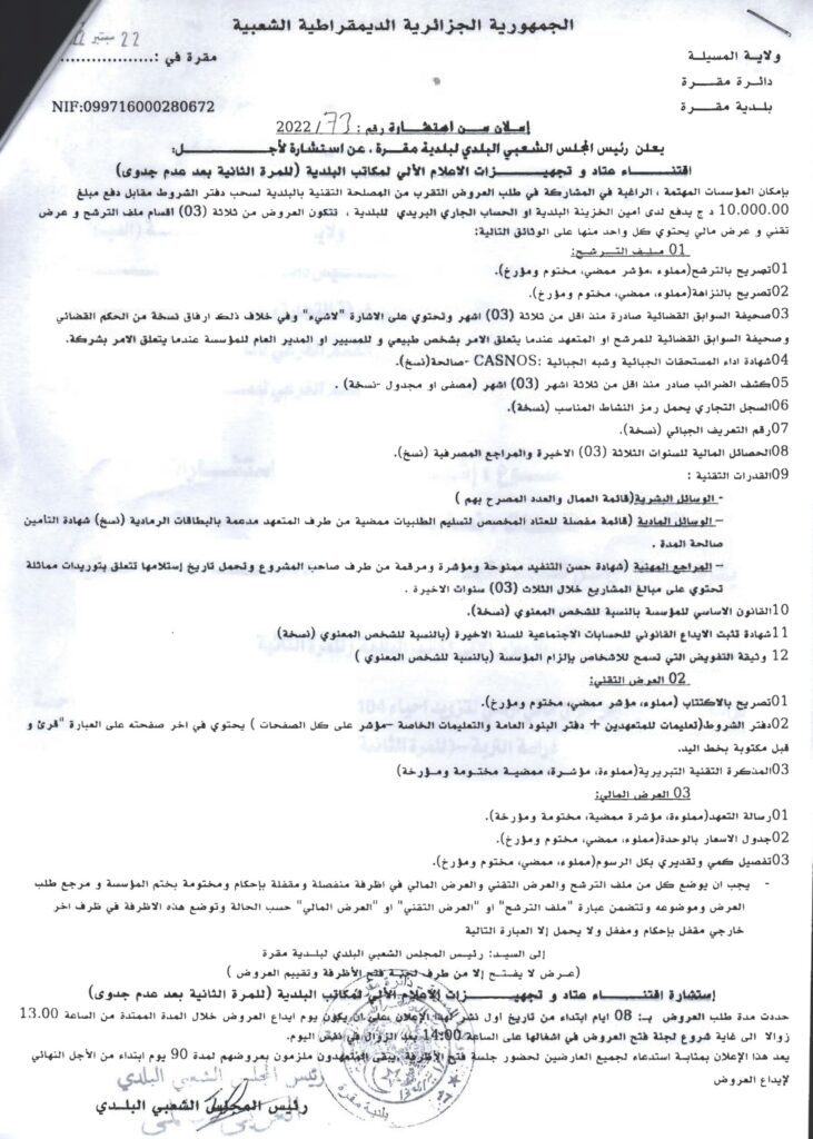 استشارة لأجل: اقتناء عتاد وتجهيزات الإعلام الآلي لمكاتب البلدية (للمرة الثانية بعد عدم جدوى)28 سبتمبر، 20220 16 شاركها فيسبوك X مشاركة عبر البريد طباعة