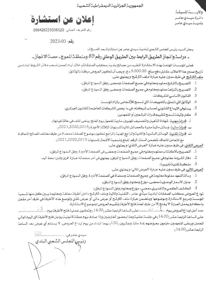 استشارة بعد الفسخ لـ : دراسة وانجاز الطريق الرابط بين الطريق الوطني رقم 89 ومنطقة المعوج -حصة الانجاز-5 أبريل، 20230 44 شاركها فيسبوك X مشاركة عبر البريد طباعة