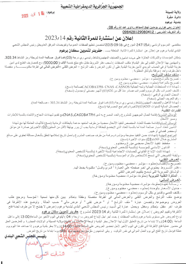 استشارة للمرة الثانية المتعلقة بـ : حفر بئر لتموين سكان برهوم16 أبريل، 20230 12 شاركها فيسبوك X مشاركة عبر البريد طباعة
