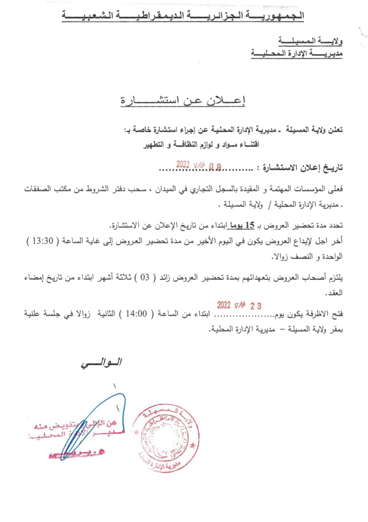 إعـلان عن استشـارة: اقتنـاء مـواد ولـوازم النظـافة والتطهيـر / مديـريـة الإدارة المحلية