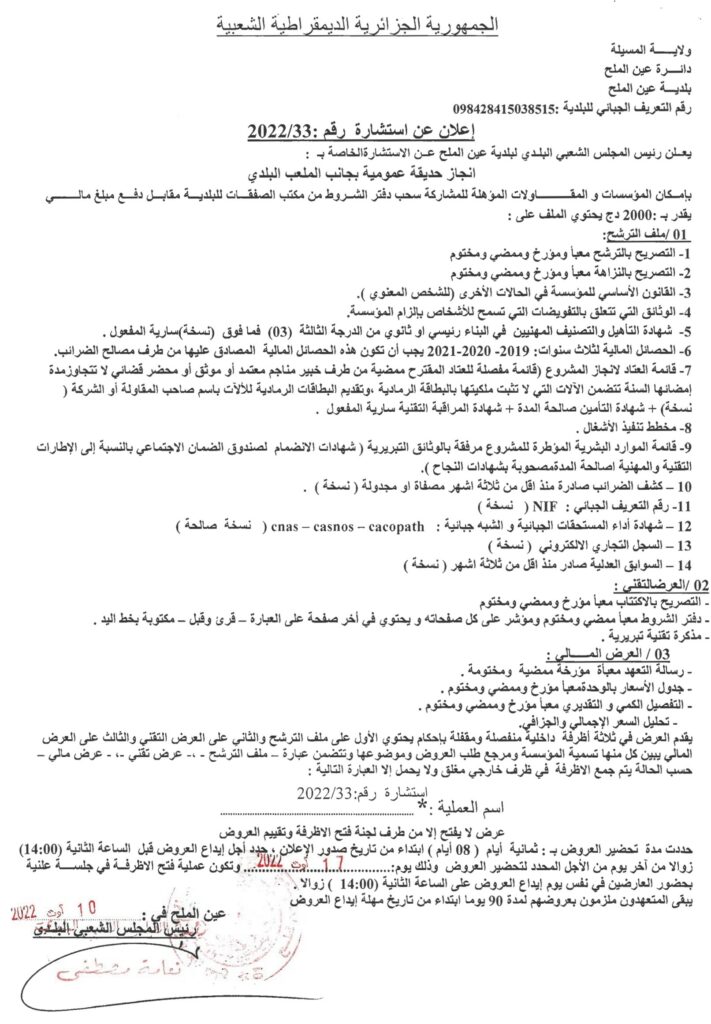 استشارة خاصة بــ : انجاز حديقة عمومية بجانب الملعب البلدي14 أغسطس، 20220 34 شاركها فيسبوك X مشاركة عبر البريد طباعة