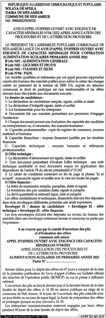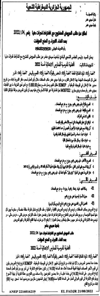 طلب عروض مفتوح مع اشتراط قدرات دنيا للتوريدات التالية: التغذية المدرسية للمدارس الإبتدائية لسنة 202221 أغسطس، 20220 27 شاركها فيسبوك X مشاركة عبر البريد طباعة